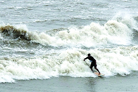 昨天,2010钱塘江国际冲浪表演赛在杭州开幕,冲浪美女玛丽·奥斯本等4位美国顶尖冲浪高手在浪尖上挑战极限。 本报记者 董旭明 林云龙 摄