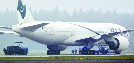 9月25日,在瑞典首都斯德哥尔摩的阿兰德国际机场,警方人员接近迫降的民航客机。 新华社发
