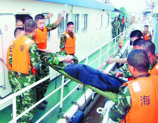 | 24日上午9时,“浙岭渔4536”在渔山列岛东南方向50海里处海域拖网作业时,江西籍船员刘某不慎被钢缆击中后脑勺昏迷,生命垂危。浙江边防总队海警一支队接到报警后,顶着9级海风、3米海浪前往救援。下午2时40分,刘某被迅速送往医院救治,目前已脱离生命危险。 陈敢 温树茂 王留碗 摄 |