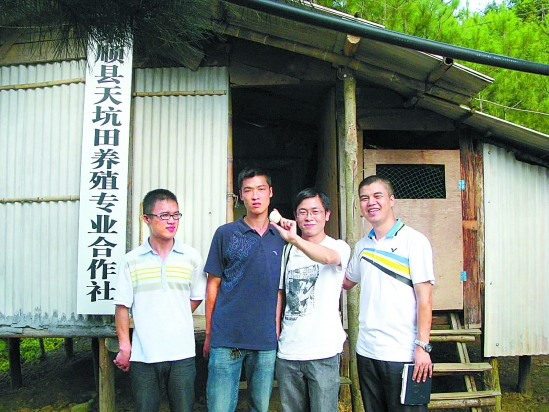 记者在箬阳村采访养殖专业合作社时,手拿孔雀蛋与毛海和等合影。