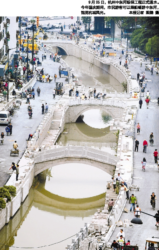 9月25日,杭州中东河综保工程正式通水。今年国庆期间,市民游客可以乘船畅游中东河,饱览杭城风光。 本报记者 梁臻 摄