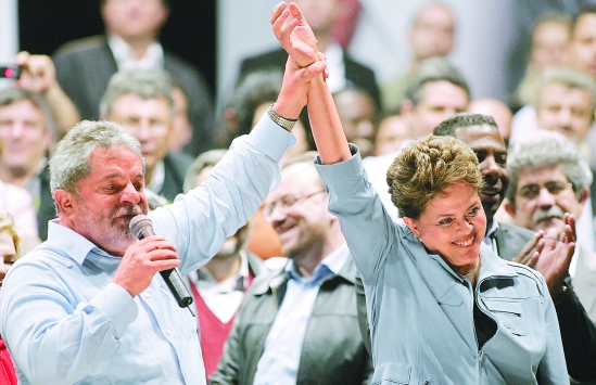 在巴西圣保罗州的奥萨斯库,巴西总统卢拉(左)在总统候选人迪尔玛·罗塞夫(右)的竞选活动上讲演。 新华社发