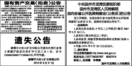 凡有意参加竞买者,即日起至2010年10月28日下午4时止请携带有效证照及交易保证金(以保证金到账时间为准),到舟山市产权交易所有限责任公司(新城行政中心水务大厦4楼)报名,节假日除外。标的详情可在报名时向本公司索取。