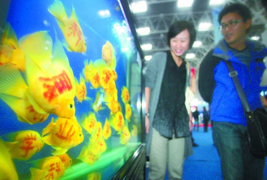 昨日,省渔业博览会在绍兴县柯桥举行,图为刺有渔业博览会字样的观赏鱼。林云龙 摄
