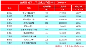 从杭州五城区二手房成交均价图来看,本月成交单价低于2.2万元占总成交的76%,和上月相同。此外,从目前成交单价排名来看,前十位的物业中,成交总价较高的前8处物业均为商业地产。由于政策对于商业地产影响甚微,因而商业地产的在目前的二手房市场中有所突显,同时高价的商业地产也拉高目前的二手房成交均价。