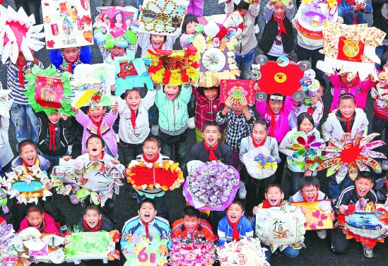 昨日,诸暨市浣东小学学生手捧写有祝福语的自制环保花喜迎国庆。