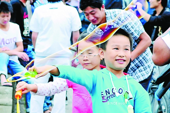 10月2日,西湖边断桥上不少游客吹起泡泡。泡泡漫天飞舞,给过往的游客带来更多的喜悦。