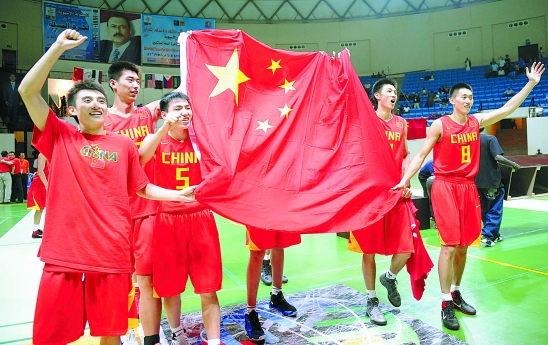 | 10月1日,在也门首都萨那举行的第21届U18亚洲青年男子篮球锦标赛决赛中,中国队以103比80战胜韩国队,夺得冠军。本场比赛中,中国队队员郭艾伦得到全队最高的28分,还贡献了全场最高的4次助攻,毫无争议地获得本次比赛最有价值球员称号。 图为中国队球员手举国旗庆祝胜利。新华社发 |