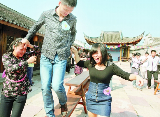 10月4日,百名未婚青年在宁波镇海区十七房景区内参加抛绣球、走七仙桥、自我展示等趣味活动,希望能在游戏中交友结缘。 胡建华 张寒 包红波 摄