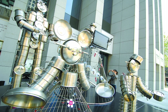 杭州商家国庆促销出新招,锅盆摆成“厨具人”。 据新华社