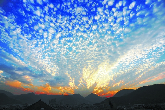 昨天落日时分,受冷空气影响,温岭上空出现大面积斑点云,形状酷似孔雀开屏,场面十分壮观。赵洪亮 摄