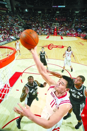 本报讯 北京时间8日,火箭迎来NBA季前赛第二战,主场以90比87击败劲旅马刺。姚明上场12分48秒,8投2中得5分,抢下7个篮板,独得3次盖帽。凯文·马丁为火箭拿下了21分,乔丹·希尔16分,阿隆·布鲁克斯14分,库特尼·李11分。德胡安·布莱尔为马刺拿下12分8个篮板,托尼·帕克10分5次助攻,蒂姆·邓肯7分7个篮板,马努·吉诺比利得5分。