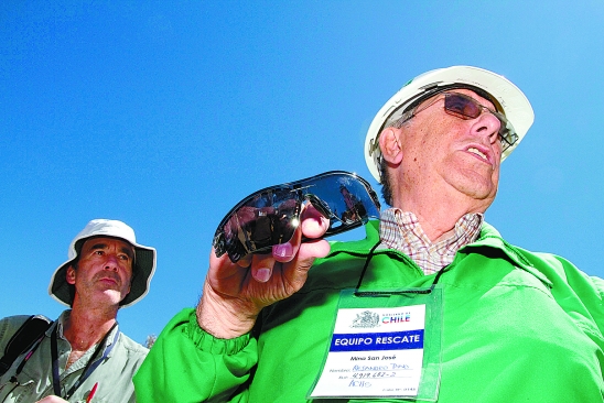 10月7日,智利矿难救援人员亚历杭德罗·皮诺(右)在圣何塞铜矿展示一副特制的墨镜,这是为避免两个月未见阳光的矿工们回到地面时眼睛受伤而准备的。新华社发