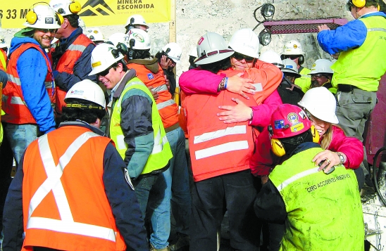 10月9日通道打通后,人们在救援现场相拥庆祝。 新华社发