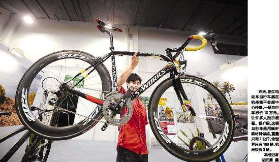 昨天,浙江电动车自行车展在杭州和平会展中心开幕,一辆自行车标价13万元,让许多人刮目相看。据介绍,这辆自行车是用碳纤维材料做成,重量只有7公斤,全世界只有100辆,杭州仅有3辆。
