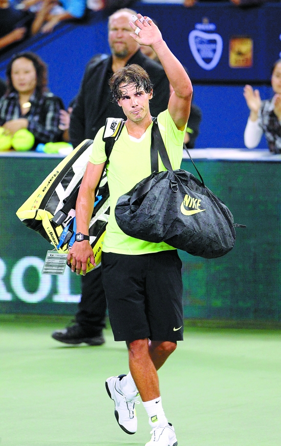 10月14日,西班牙选手纳达尔退场时向观众挥手告别。当日,在上海网球大师赛中,西班牙选手纳达尔以1比2不敌奥地利选手梅尔泽,无缘八强。 新华社发