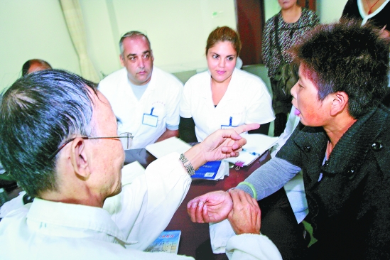 | 48岁的黄女士两腿关节疼痛,专程从永康赶到省中医院,找中外科国家级名中医鲁贤昌医师诊治。 “自天气转冷以后,50个病人至少有40个患退变性关节炎。”鲁贤昌认为,天气转凉,血管收缩,45岁以上关节薄弱的人,就适应不了,容易犯病。图为来自以色列的学生正跟随鲁贤昌问诊。于伟 摄 |