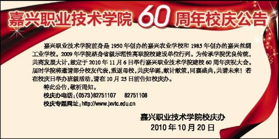 嘉兴职业技术学院前身是1950年创办的嘉兴农业学校和1985年创办的嘉兴丝绸工业学校。2009年学院跻身省级示范性高职院校建设单位行列。为传承学院优良传统,共商发展大计,兹定于2010年11月6日举行嘉兴职业技术学院建校60周年庆祝大会。届时学院将邀请部分校友代表,重返母校,共庆华诞,献计献策,同襄盛典,共谱未来!若在校庆日举办班级活动,请在10月25日前告知校庆办。