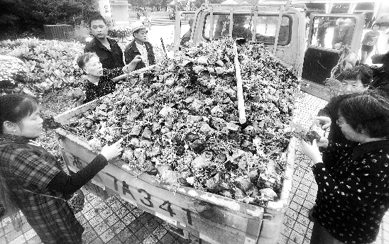 10月20日,杭州吴山广场上,原本用于国庆装饰的鲜花像垃圾一样被处理掉,围观市民直喊“浪费”。 记者 林云龙 摄