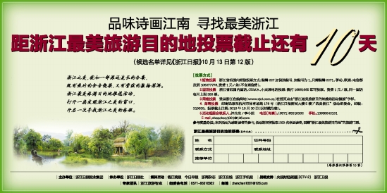 4.邮寄投票 邮寄选票至杭州市体育场路178号(浙江日报新闻大楼5楼)“选美浙江”活动组委会,邮编:310039。投票截止日期:2010年10月30日(以邮戳为准)。
