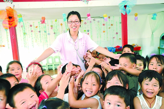 德清在全县村级社区卫生服务站实施“大学生村医”计划,经过选拔和培训的30名大学生村医已全部进村上岗。图为毕业于省中医药大学的郑丽萍在为幼儿园孩子检查身体。记者 叶寒青 通讯员 宣宏 摄