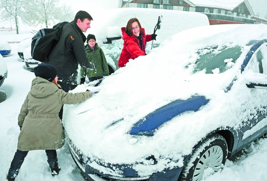 图为在德国南部的费尔德贝格,一家人在清理汽车上的积雪(10月20日摄)。新华社发