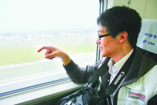 记者颜伟杰对能让窗外景色移动变慢的玻璃很好奇。