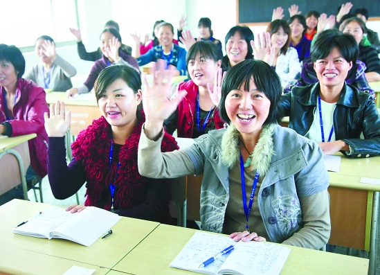 日前,衢州中专第六期高级家政培训班上,学员们打着手势学习英语口语。英语正成为衢州保姆的必修课。 鲍卫东 廖建霞 摄