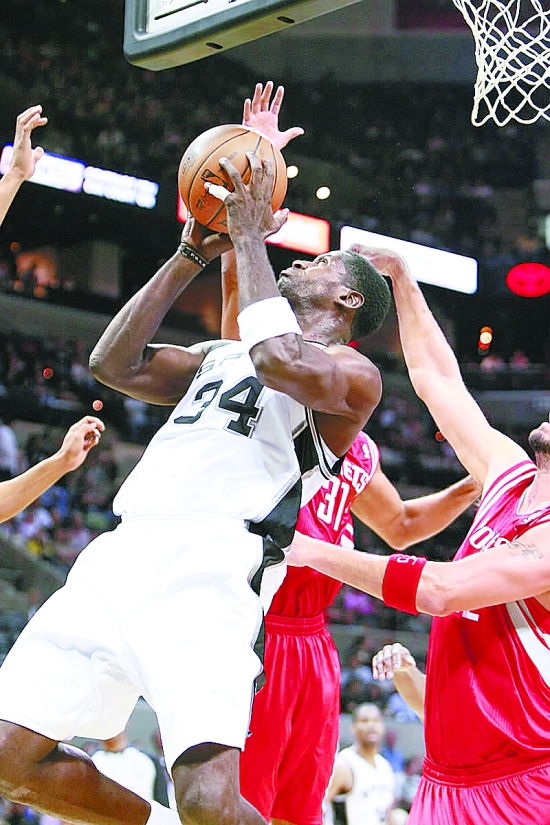 10月21日,马刺队球员麦克代斯(上)突破上篮。当日,在NBA季前赛中,休斯敦火箭队客场以103比111不敌圣安东尼奥马刺队。 新华社发