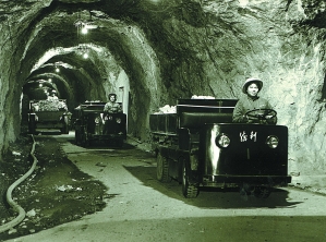 浙江省某人防工地工人们正在用电瓶车运渣。
