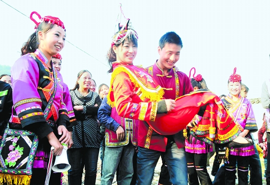 10月28日,“醉美九月九”第六届畲族丰收节在安吉县章村镇举行。畲族婚嫁、放竹排、斗牛表演等活动吸引了许多游客。 通讯员 姚远 於袁民 摄
