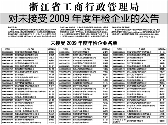 根据《中华人民共和国公司登记管理条例》第五十九条、《中华人民共和国企业法人登记管理条例》第二十四条和《企业年度检验办法》第四条的规定,企业应当在每年3月1日至6月30日期间向企业登记机关提交年检材料。截至2010年6月30日,尚有部分企业未向我局申报2009年度年检,也未在我局责令的期限内接受年检。现根据《企业年度检验办法》第十九条第二款的规定,对尚未接受2009年度年检的企业予以公告(名单附后)。相关企业应当自本公告发布之日起60日内到浙江省工商行政管理局(地址:杭州市莫干山路77号金汇大厦北门908室)办理年检并接受处罚。逾期仍不接受年检的,我局将依法吊销其营业执照。