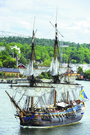 | 2010年6月14日,瑞典斯德哥尔摩,重新建造的18世纪东印度公司“哥德堡”号商船复制品抵达当地港口,并将参加王储维多利亚公主的大婚庆典。 CFP供图 |