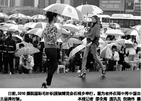 日前,2010濮院国际毛针织服装博览会在桐乡举行。图为老外在雨中秀中国自主品牌时装。 本报记者 邵全海 通讯员 倪晓伟 摄