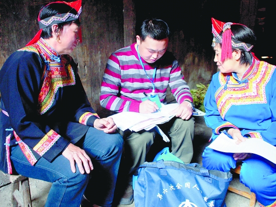 11月1日中午,松阳县象溪镇人口普查员蓝子民(中)到畲族村民蓝萍花(右一)家普查登记。