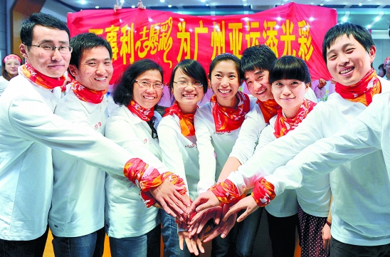 昨日,参加广州亚运会的杭州志愿者出征。他们由在杭高校大学生、教师和公司职员等组成。本报记者 李震宇 摄