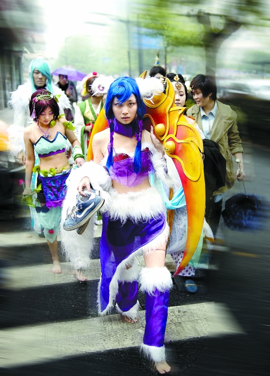 动漫表演者演出结束时,宁愿赤脚走在雨后的马路上。