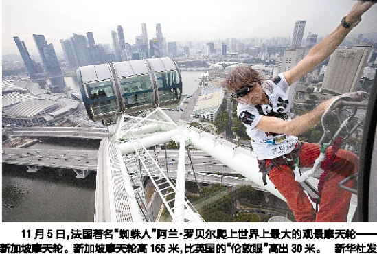 11月5日,法国著名“蜘蛛人”阿兰·罗贝尔爬上世界上最大的观景摩天轮——新加坡摩天轮。新加坡摩天轮高165米,比英国的“伦敦眼”高出30米。 新华社发