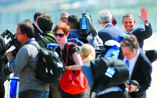 11月6日,美国总统奥巴马(后排右一)抵达印度孟买的国际机场。