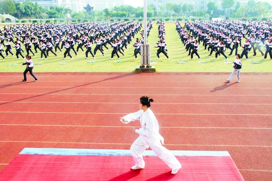 11月4日,伴着一曲舒缓悠扬的古乐,宁波市镇海区蛟川书院600名学子在运动场上进行太极拳汇报表演,展现了学生在“阳光体育”中变得更加“阳光”。