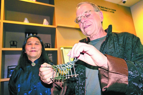 在美国纽约的美国华人博物馆,收藏者在“中国传统益智游戏展”上演示九连环。