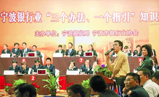 | 由宁波银监局、宁波银行业协会共同主办,全市33家金融机构参加的宁波银行业“三个办法一个指引”知识竞赛日前举行决赛,获得竞赛一等奖的代表队将代表宁波银行业参加华东地区“三个办法一个指引”知识竞赛。该活动旨在进一步加大贷款新规的宣传力度,严格执行贷款新规。 沈颖俊 摄 |