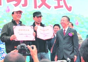 江山市领导向唐国强、刘劲颁发江山市荣誉市民证书