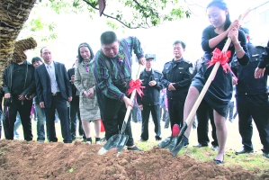 毛新宇夫妇在“绿色中国毛氏文化林”亲手种下一棵桂花树