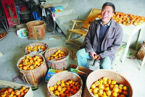 采摘时节,凌家堂屋里堆满了十来个箩筐里的柿子,几位农妇正把箩筐里的柿子一个个地往纸箱里装。箱子上印着“方山柿,柿柿如意”的广告语。“一箱卖120元,都是山外人订购的,我都不用跑出去销售。”凌羽丰说。