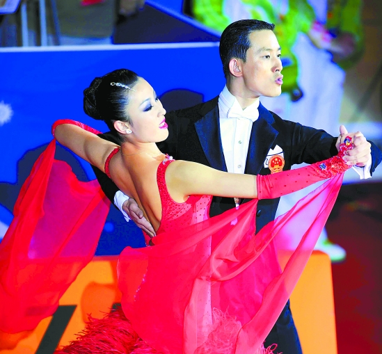 11月13日,中国选手梁瑜洁(左)/沈宏在比赛中。当日,在广州亚运会体育舞蹈探戈舞比赛中,中国选手梁瑜洁/沈宏为中国军团夺取了第1000枚亚运金牌。 新华社发