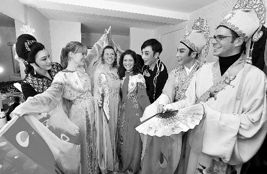 当地时间11月15日晚,越剧明星版《梁山伯与祝英台》在法囯加莱省省会阿腊斯大剧院上演,浪漫而凄美的爱情故事在法文字幕的解读下,引来当地观众的阵阵掌声。明星版《梁祝》由浙江绍兴市演出有限公司等联合江浙沪闽等地十余家越剧院团联袂打造。图为演出间隙,阿尔图瓦大学学中文的法囯学生过把戏瘾。