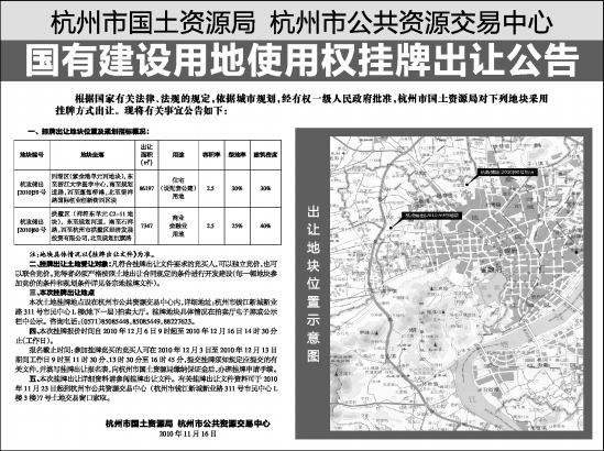五、本次挂牌出让详细资料请参阅挂牌出让文件。有关挂牌出让文件资料可于2010年11月23日起到杭州市公共资源交易中心(杭州市钱江新城新业路311号市民中心L楼3楼)7号土地交易窗口索取。