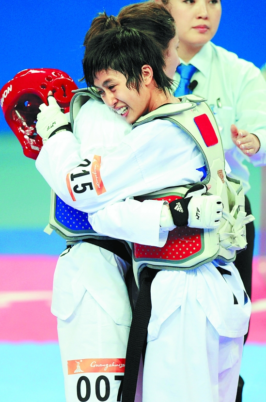 11月17日,黄显咏(右)和达娜·图兰在比赛后拥抱。当日,在广东体育馆举行的第16届亚运会跆拳道女子46公斤以下级决赛中,中华台北选手黄显咏战胜约旦选手达娜·图兰,夺得冠军,达娜·图兰获得亚军。 新华社发