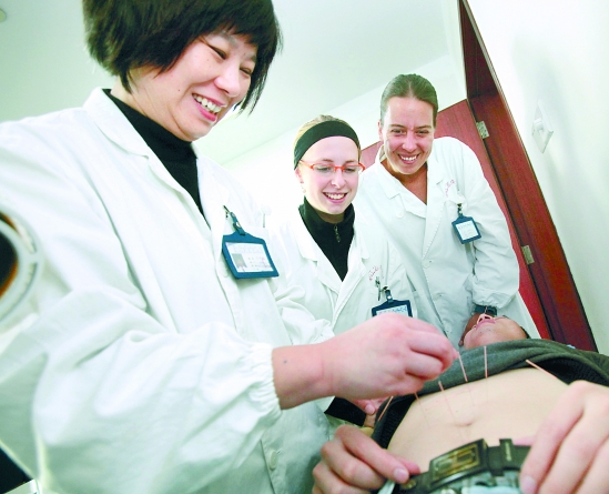 11月17日,浙江省中医院针灸科,来自加拿大蒙特利尔玫瑰山学院的玛丽和爱莎,正跟随省级名中医宣丽华主任医师(左一)学习针灸治疗面瘫技法。近年来,每年在浙江省中医院进修实习的洋学生达300余人。于伟 摄